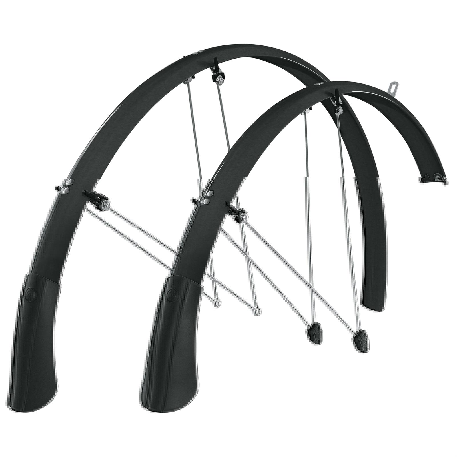 Lang, länger, Longboard. Das SKS Schutzblech-Set BLUEMELS LONGBOARD mit extra langen Spoilern ist der perfekte Begleiter bei jedem Wetter. Die Schmutzfänger in glänzendem Schwarz sind sogar die längsten Radschützer mit der größten Schutzwirkung auf dem Markt! Dank der flexiblen Sandwichkonstruktion, in der hochfeine Aluminiumstreifen in einer Kunststoff-Ummantelung eingebettet werden, sind sie extrem robust, biegesteif und korrosionsgeschützt. Das Secu-Clip-Sicherheitssystem sorgt für ein Entkoppeln der Streben, wenn Zweige zwischen die Speichen gelangen, so dass das Rad nicht blockiert. Inklusive Strebensatz, Festbrücke aus Edelstahl und Montagematerial.
