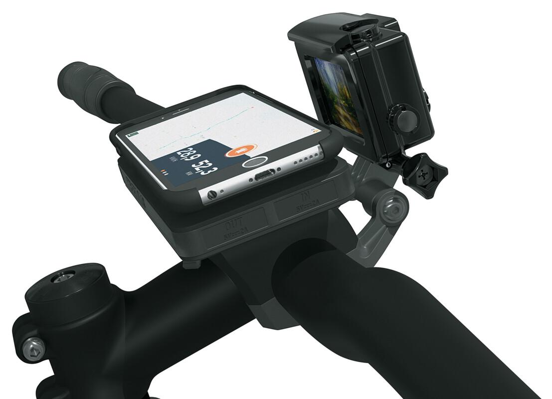 Ideal, um unvergessliche Abenteuer bildlich festzuhalten: Mit dem COM/CAM Adapter lässt sich eine Action Cam direkt an der COMPIT Handyhalterung befestigen. Die Position der Kamera vor dem Fahrrad ermöglicht die Aufnahmen rasanter Fotos und Videos. Sie integriert sich zudem perfekt in das COMPIT System und sorgt so für ein aufgeräumtes Cockpit. Der Adapter besteht aus schlagfestem Hochleistungskunststoff und ist neigungsverstellbar und hält GoPro & Co. auch in ruppigem Gelände fest und sicher.