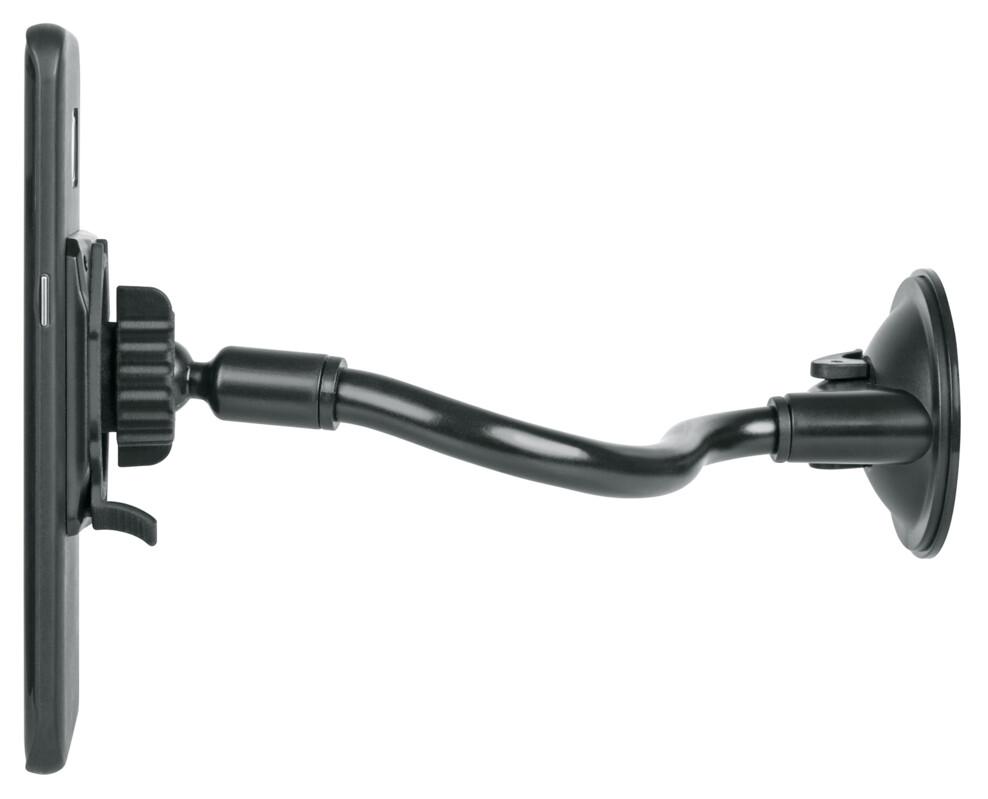 Ob im Auto, in der Küche oder am Arbeitsplatz: Mit der COMPIT FLEXX Smartphonehalterung ist das Handy immer in Sichtweite. Das universelle System verfügt über einen Flexarm, der sich ganz unkompliziert in die gewünschte Position biegen lässt. Durch das drehbare Kugelgelenk ist das Handy winkelverstellbar und kann horizontal oder vertikal verwendet werden. So hat man das Smartphone im Blick und die Hände sind frei. Der Silikon-Saugnapf mit Vakuum-Hebelmechanismus gewährleistet einen zuverlässigen Halt an allen glatten Oberflächen wie Fliesen, Windschutzscheiben oder Glas. Es wird empfohlen, die Fläche vorher zu reinigen. Dank der bewährten COMPIT Bajonett-Aufnahme kann das Smartphone mit einem Dreh an der Halterung befestigt und wieder abgenommen werden. Hierfür ist ein spezielles COMPIT-Cover erforderlich.